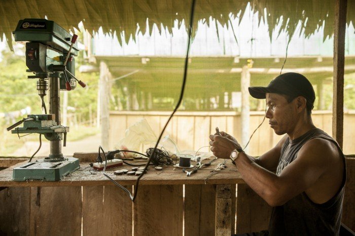- Carlos, el padre de familia, se dedica a diversas actividades. Es, por ejemplo, artista y artesano. Talla dijes trabajando la tagua o yarina —una semilla conocida como «el marfil del bosque»—, hace esculturas con la topa o madera balsa, y pinta murales en las paredes de su casa y la de sus amigos.