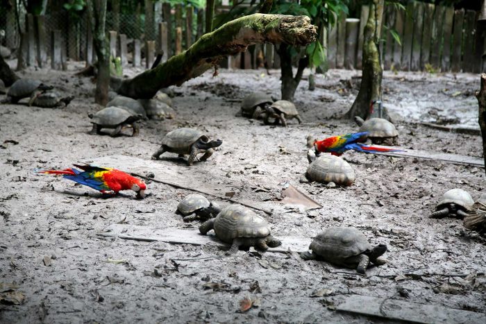 - Si bien la especialidad del CREA son los mamíferos, también existen aves y quelonios. En este caso, dos guacamayos comparten espacio con las tortugas motelo. Estas aves fueron rescatadas de comerciantes que iban a venderlos como mascotas. Los guacamayos tenían las plumas cortadas para que no puedan volar. Sin embargo, apenas sus plumas vuelvan a crecer, ellas mismas se liberarán.