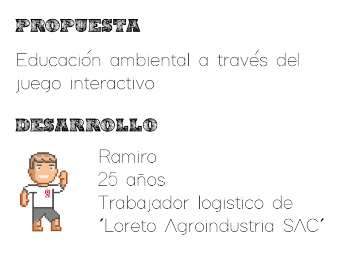 -Grupo Free Horizons: su propuesta fue un juego interactivo llamado “Q’utunta”, una palabra aymara que significa “aprendizaje”. Mediante la exposición de distintos retos a los que debe enfrentarse un personaje de ficción llamado Ramiro, este proyecto busca brindar educación ambiental. El grupo lo conformaron Teresa Licito, Andrea Drozen, Jhon Villanueva y Erich Balois.