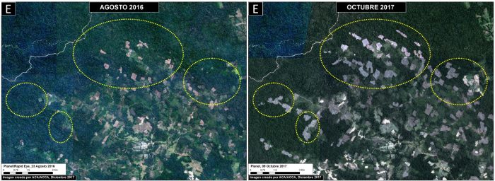 En Santa Rita y Guacamayo la deforestación fue causada por la actividad agrícola, que en el 2017 ocasionó 1 170 hectáreas. El cultivo de papaya y cacao serían los cultivos que se realizan.
