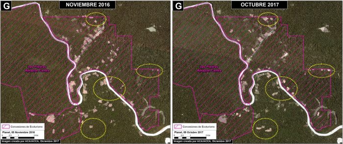 Finalmente, Las Piedras, donde en 2 concesiones de ecoturismo ubicadas a lo largo del río Las Piedras se documentó la deforestación de 134 hectáreas en el 2017 por plantaciones de cacao y áreas usadas como pasto para ganado. La zona es reconocida, señala el reporte, como una de excepcional presencia de fauna silvestre. Desde el 2013 se ha acumulado un total de 605 hectáreas deforestadas.