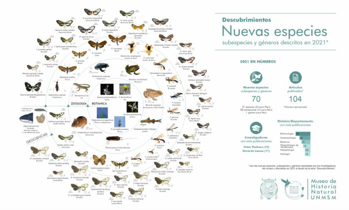 El año 2021 fue importante para el Museo de Historia Natural de la Universidad Nacional Mayor de San Marcos (UNMSM) en cuanto a producción científica. A pesar de las limitaciones impuestas por la pandemia, se produjeron más de 104 artículos científicos que fueron publicados en importantes revistas científicas nacionales y extranjeras durante el año.