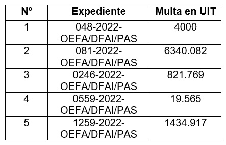 Actualmente, solo 5 se encuentran con determinación de responsabilidad. Al respecto, según información brindada por el OEFA, el estado de las multas hasta julio de 2024 es el siguiente: