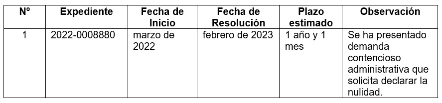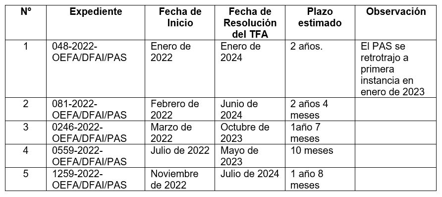 En el caso en particular, como se puede apreciar de la tabla, el OEFA en el mejor de los casos se ha tardado diez meses en resolver en un caso; sin embargo, en la mayoría de ellos el plazo de resolución ha superado un año.