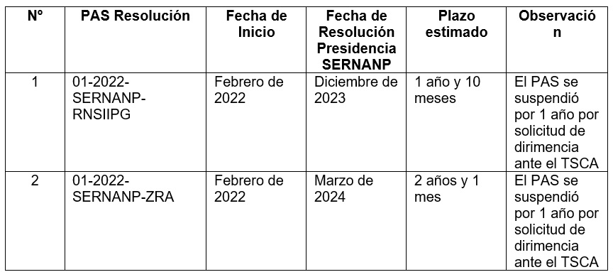 Cabe precisar que el plazo de suspensión se debió a que Relapasaa presentó una solicitud de dirimencia ante el Tribunal de Solución de Controversias Ambientales (TSCA) para esclarecer un presunto conflicto de competencias entre Sernanp y los gobiernos locales. En julio de 2023, el TSCA declaró infundada la solicitud de Relapasaa, al concluir que no existía conflicto de competencias de fiscalización ambiental.