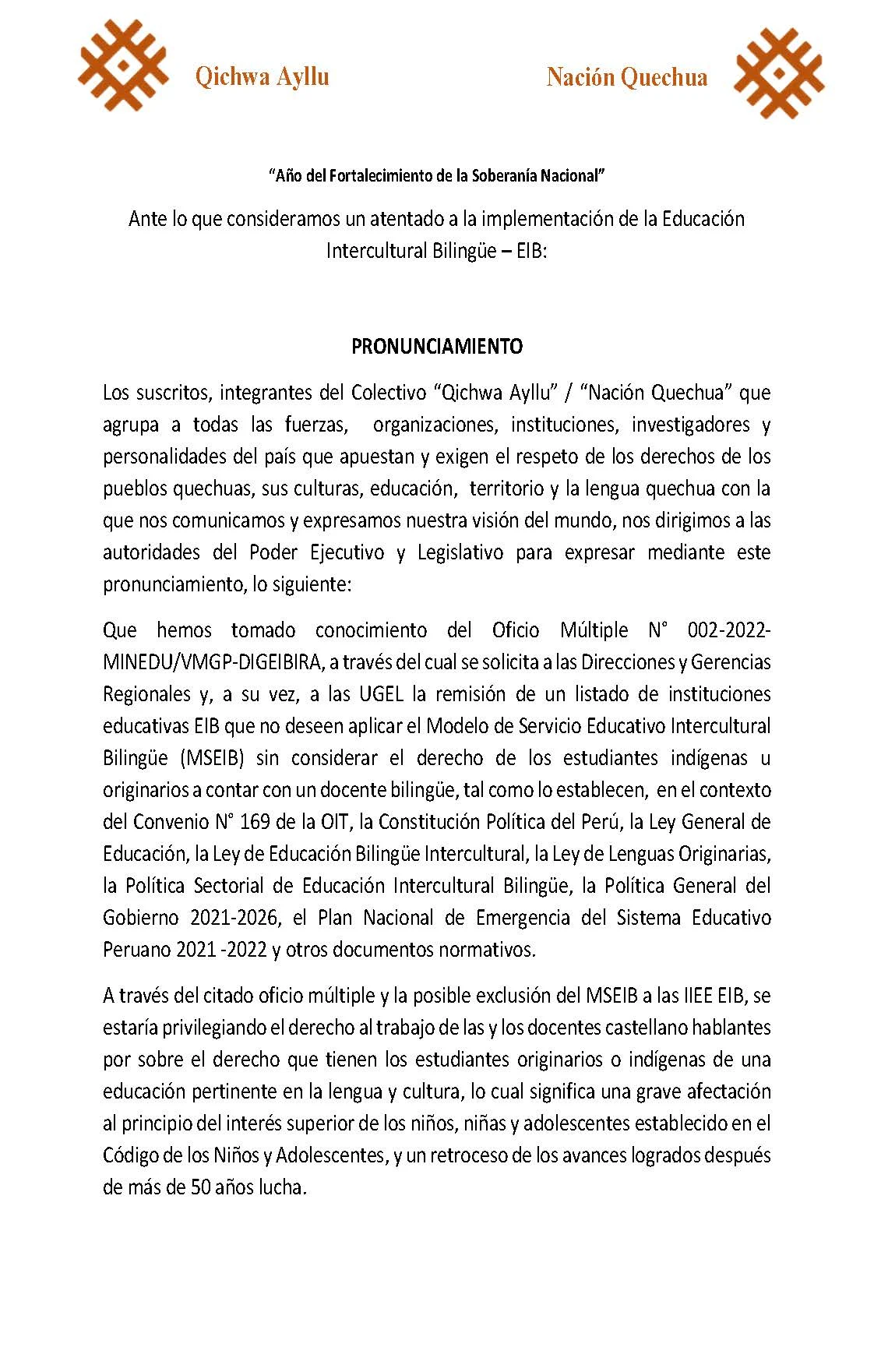 En contra de la medida planteada por el Minedu también se pronunciaron otras organizaciones como Qichwa Ayllu, la Asociación Interétnica de Desarrollo de la Selva Peruana (Aidesep) y el Formabiap la principal institución de formación de docentes bilingües de la Amazonía peruana.