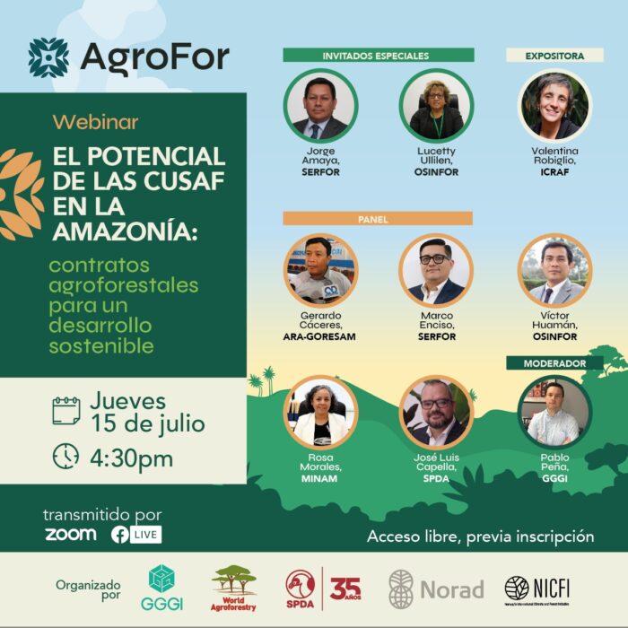 Este jueves 15 de julio, de 4:30 pm a 5:45 pm, se realizará el Webinar “El potencial de las CUSAF en la Amazonía: contratos agroforestales para un desarrollo sostenible”, en donde se presentarán los retos y oportunidades que presentan los contratos de CUSAF (Cesiones en Uso para Sistemas Agroforestales), como un mecanismo legal para impulsar el desarrollo sostenible en la Amazonía peruana, así como su alcance y beneficios para el sector forestal, los agricultores y los bosques.