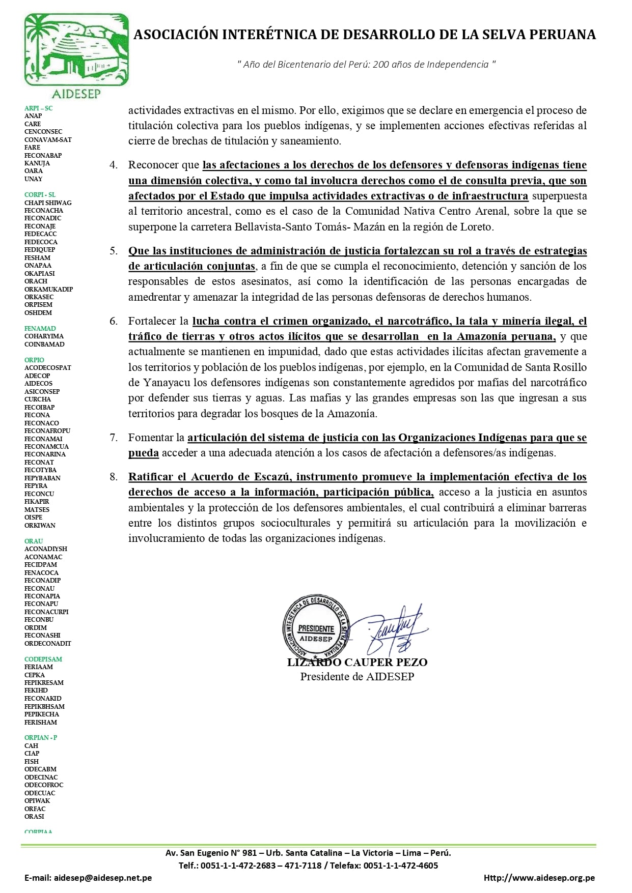 En este documento advierten que es “necesario asegurar una articulación efectiva con diversas instituciones estatales” y para ello piden al presidente que “respalde e implemente acciones concretas” enfocadas en asegurar la protección de quienes defienden los derechos indígenas.