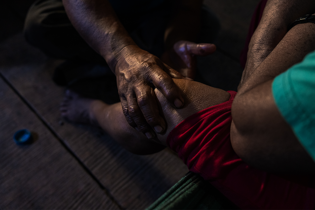 Desde hace algunos días, la señora Rosalía Dancuart, integrante de la comunidad nativa Boca Pariamanu (del pueblo indígena amahuaca) viene quejándose de un dolor en las rodillas que no le permite realizar sus actividades con normalidad. Le ha pedido a Alberto Inuma Fernández (62), experto en medicina natural de la comunidad, que le ayude a aliviar el dolor.
