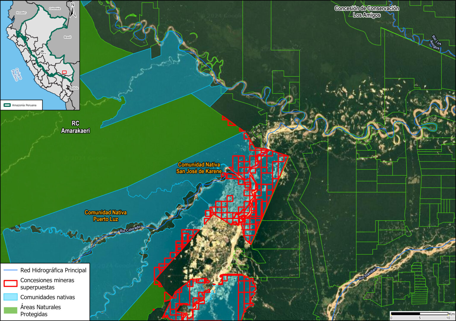 En la Reserva Comunal Amarakaeri (RCA) se observa la superposición de concesiones minera en las comunidades nativas San José de Karene y Puerto Luz, ubicadas en su área de influencia.