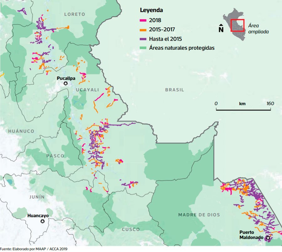 Según el cruce entre imágenes de Proyecto de Monitoreo de la Amazonía Andina (MAAP por sus siglas en inglés) con datos sobre concesiones y permisos forestales (títulos habilitantes) en las zonas donde están las vías forestales, el estudio advierte sobre cuatro áreas donde se presume que hay tala ilegal: en el límite de la Reserva Comunal Asháninka (entre Junín y Cusco); el interior de concesiones maderables caducadas en Ucayali y de concesiones caducadas de castaña en Madre de Dios, y en la zona adyacente a la Reserva Comunal El Sira (Ucayali), explicó el diario.