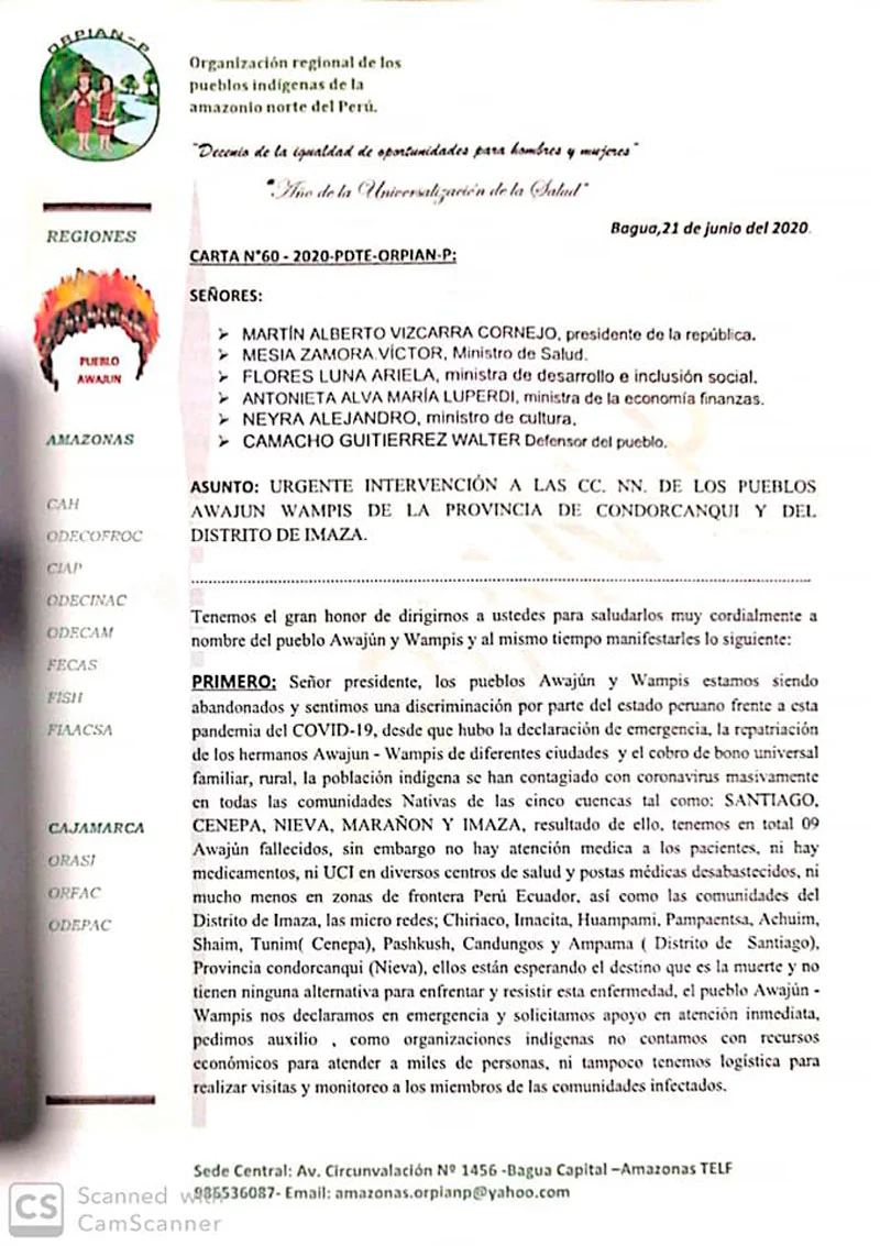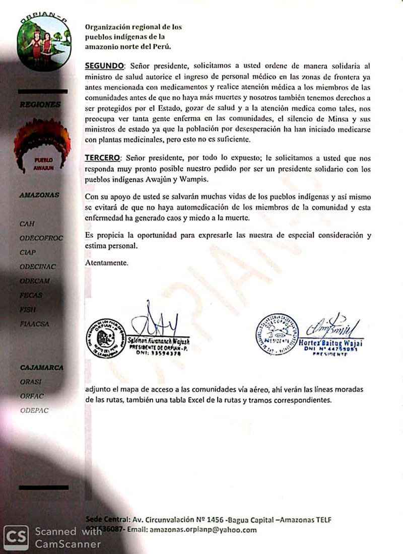“Señor presidente, los pueblos awajún y wampis estamos siendo abandonados y sentimos una discriminación por parte del Estado peruano frente a esta pandemia del COVID-19. Desde que hubo la declaración de emergencia, la repatriación de los hermanos awajún-wampis de diferentes ciudades y el cobro de bono universal familiar, rural, la población indígena se ha contagiado con coronavirus masivamente en todas las comunidades nativas de las cinco cuencas: Santiago, Cenepa, Nieva, Marañón e Imaza. Resultado de ello tenemos en total 9 awajún fallecidos. Sin embargo no hay atención médica a los pacientes, ni hay medicamentos, ni UCI en diversos centros de salud y postas médicas desabastecidos”, se lee en la carta.