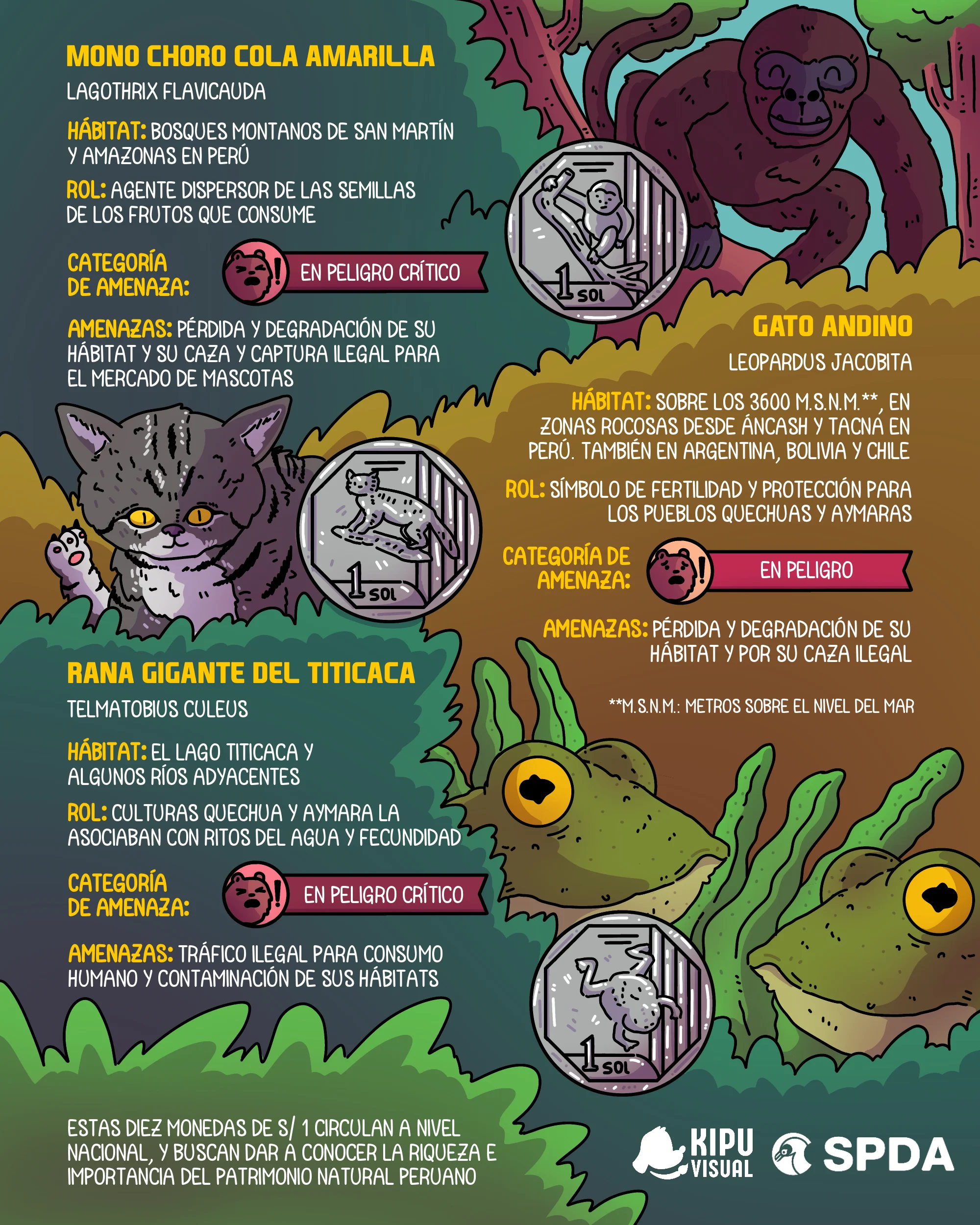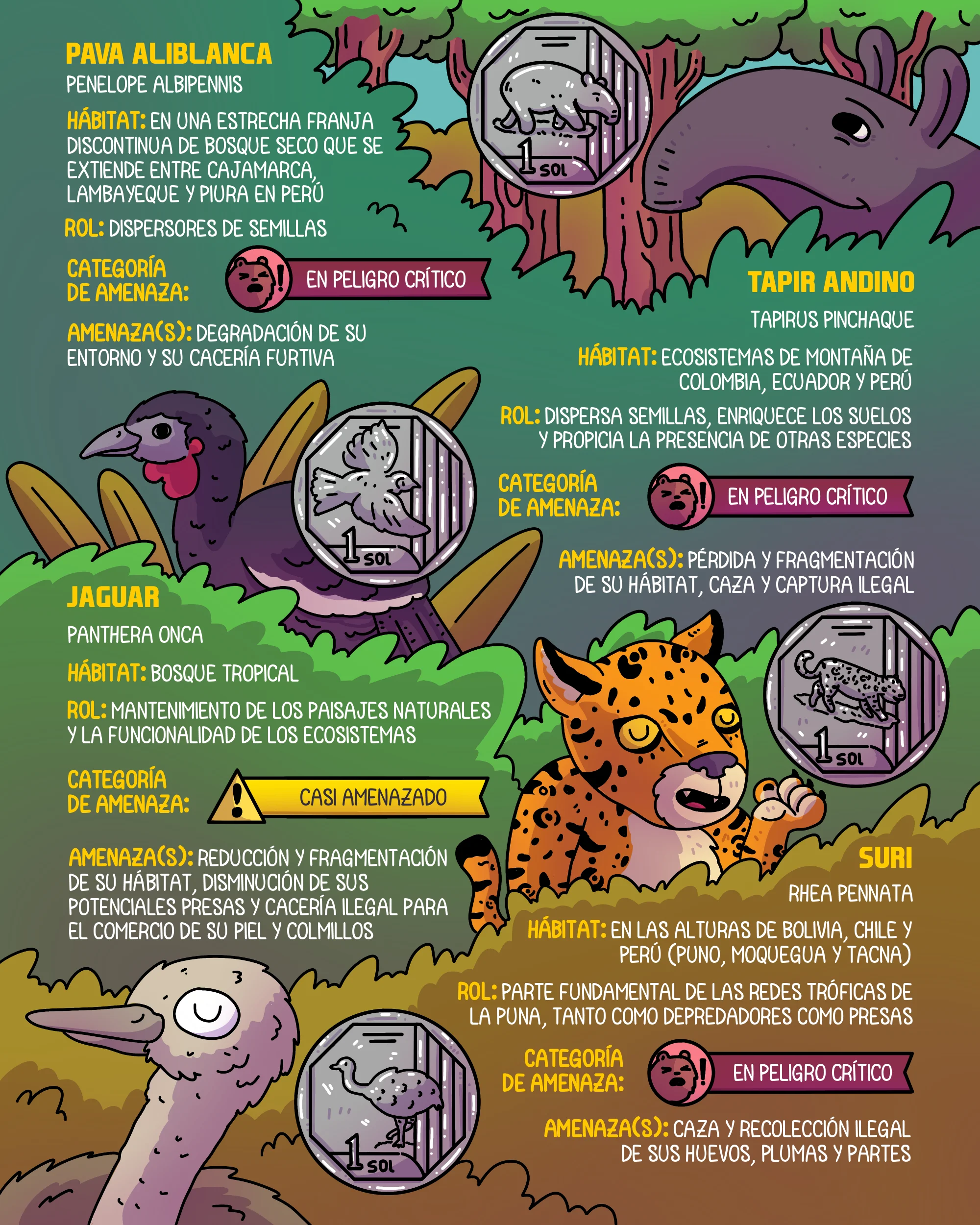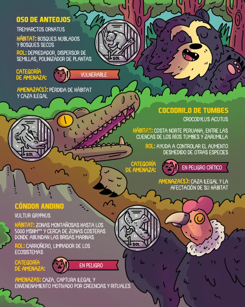 ¿Cuáles son los animales amenazados de Perú que aparecen en la moneda de 1 sol?