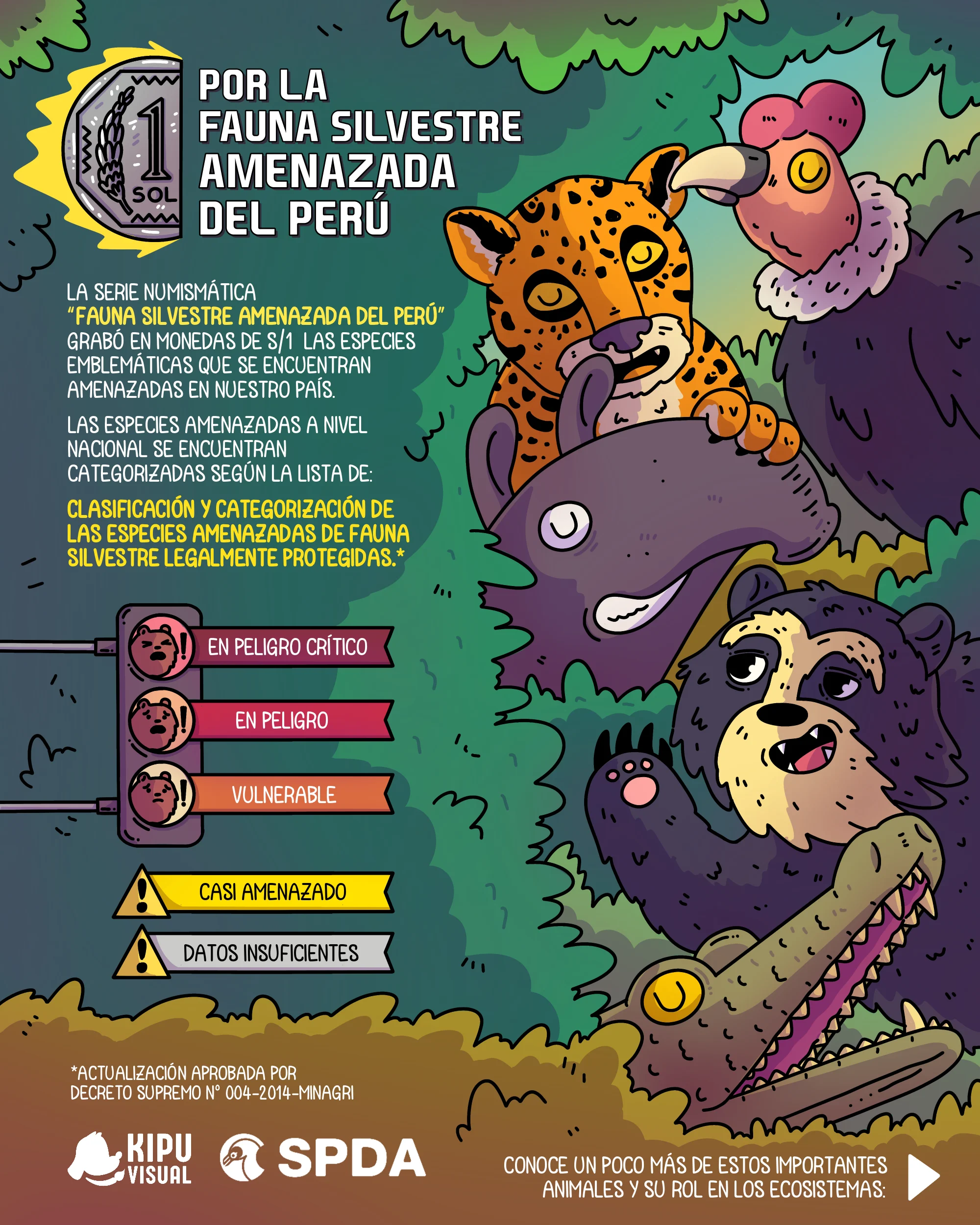Aunque vivimos en un país megadiverso, existen 389 especies de fauna silvestre que se encuentran amenazadas y con el objetivo de crear conciencia en la ciudadanía sobre las especies en peligro, el Banco Central de Reserva (BCR) en colaboración con el Ministerio del Ambiente (Minam), creó la serie numismática “Fauna Silvestre Amenazada del Perú”. La serie está compuesta por 10 monedas de S/. 1 sol de curso legal, que pueden ser utilizadas en cualquier transacción económica.