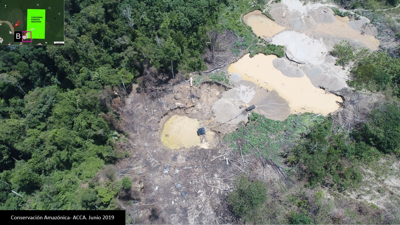 Caso B. En la foto realizado como verificación con vuelo de dron se puede observar un campamento minero y a las personas que realizan la actividad de forma ilegal dentro de la Concesión para Ecoturismo “Sonidos de la Amazonía”. Fuente: ACCA.