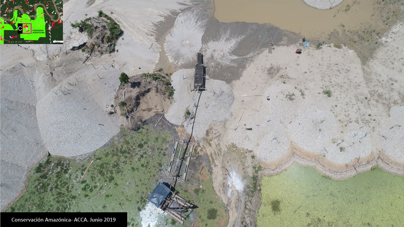 Caso C. En este caso, además de la alerta temprano por identificación satelital, también se contó con la denuncia de terceros. En la imagen se puede ver el campamento minero ilegal ubicado en la Concesión Forestal No Maderable “AGROFOCMA”. Fuente: ACCA.