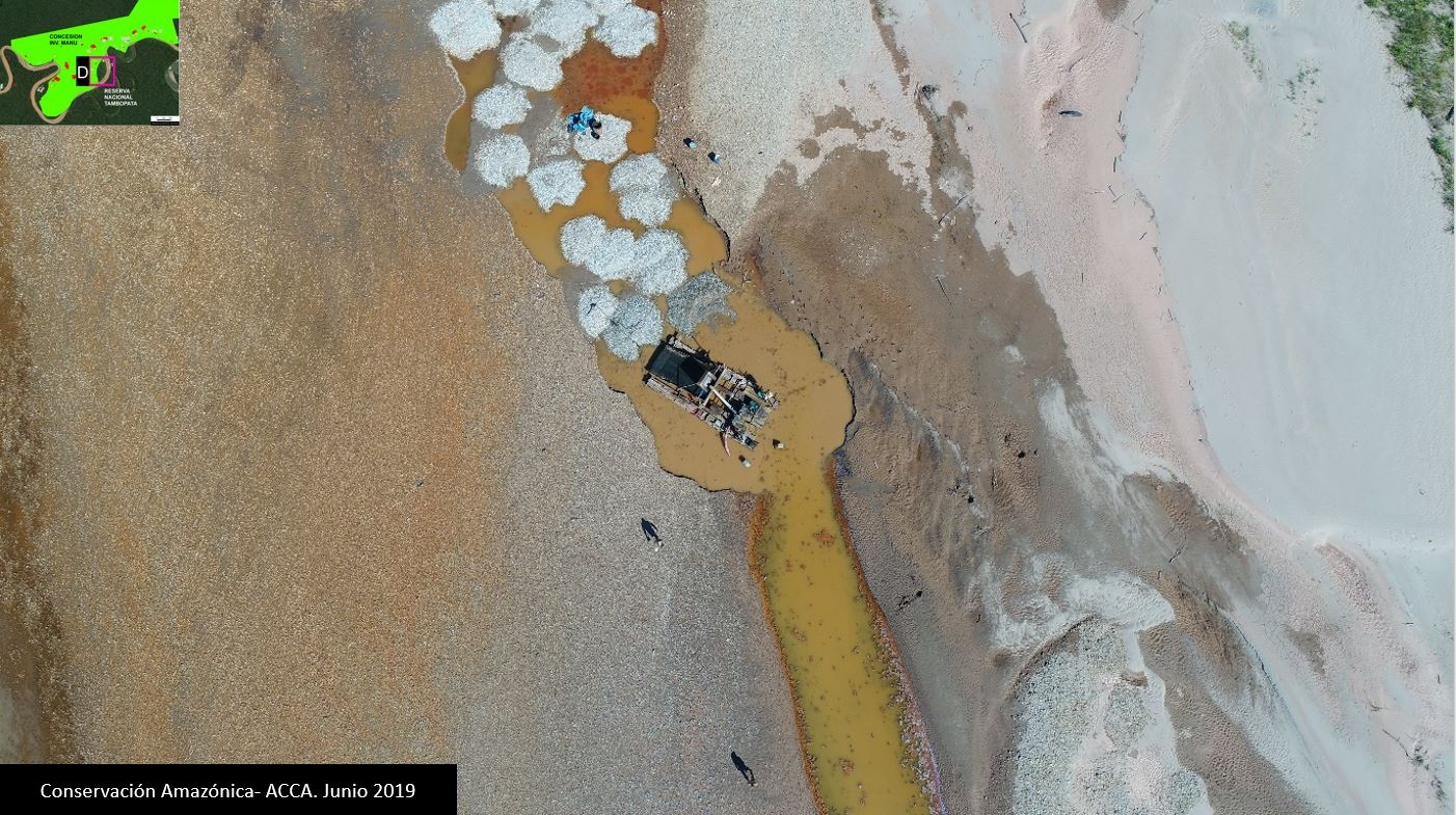Caso D. Inicialmente en este caso se registró una alerta temprana de deforestación, que posteriormente fue confirmada, además de la identificación con dron de la actividad minera ilegal en la Concesión de Conservación “Inversiones Manu”. Fuente: ACCA.