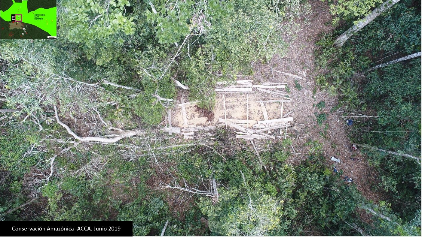 Caso E. Con la verificación a través de vuelos de dron se registró la imagen donde se observan tablones de cedro, producto de la tala ilegal en la Concesión Forestal de Castaña “Sara Hurtado”. Fuente: ACCA.