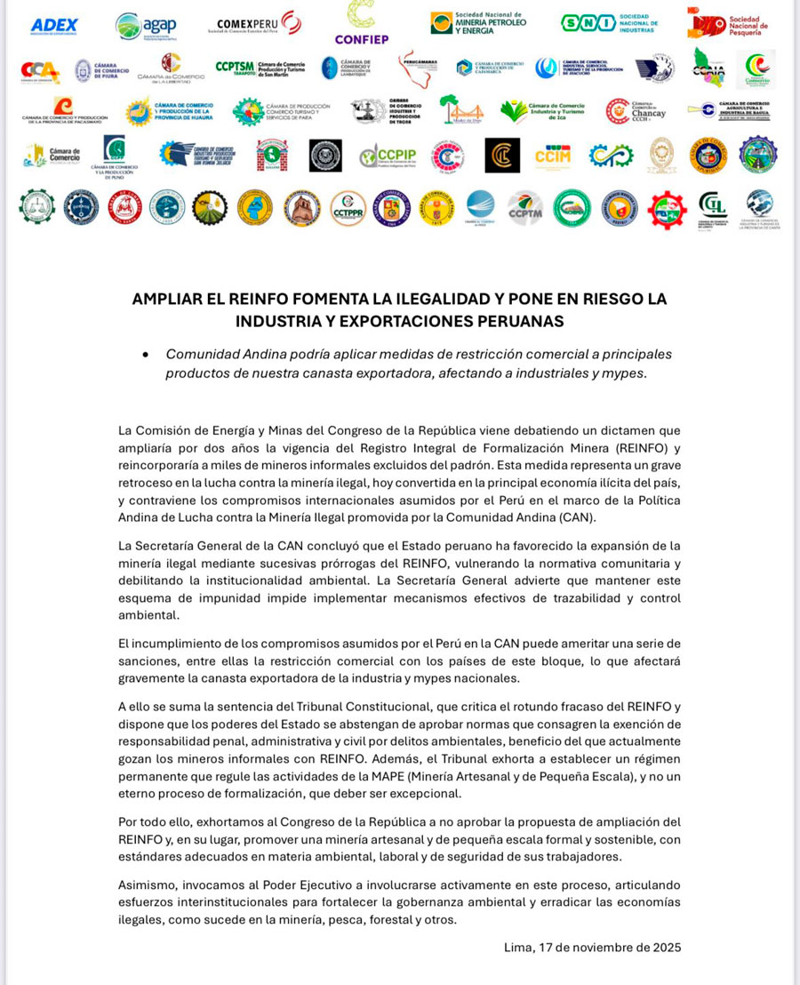 Antes de someterse a votación en la Comisión de Energía y Minas, gremios empresariales, entre ellos Adex, Confiep, Comex, la Sociedad Nacional de Minería Petróleo y Energía, entre otros, señalaron que “esta medida representa un grave retroceso en la lucha contra la minería ilegal, hoy convertida en la principal economía ilícita del país, y contraviene los compromisos internacionales asumidos por el Perú en el marco de la Política Andina de Lucha contra la Minería ilegal promovida por la Comunidad Andina (CAN)”.