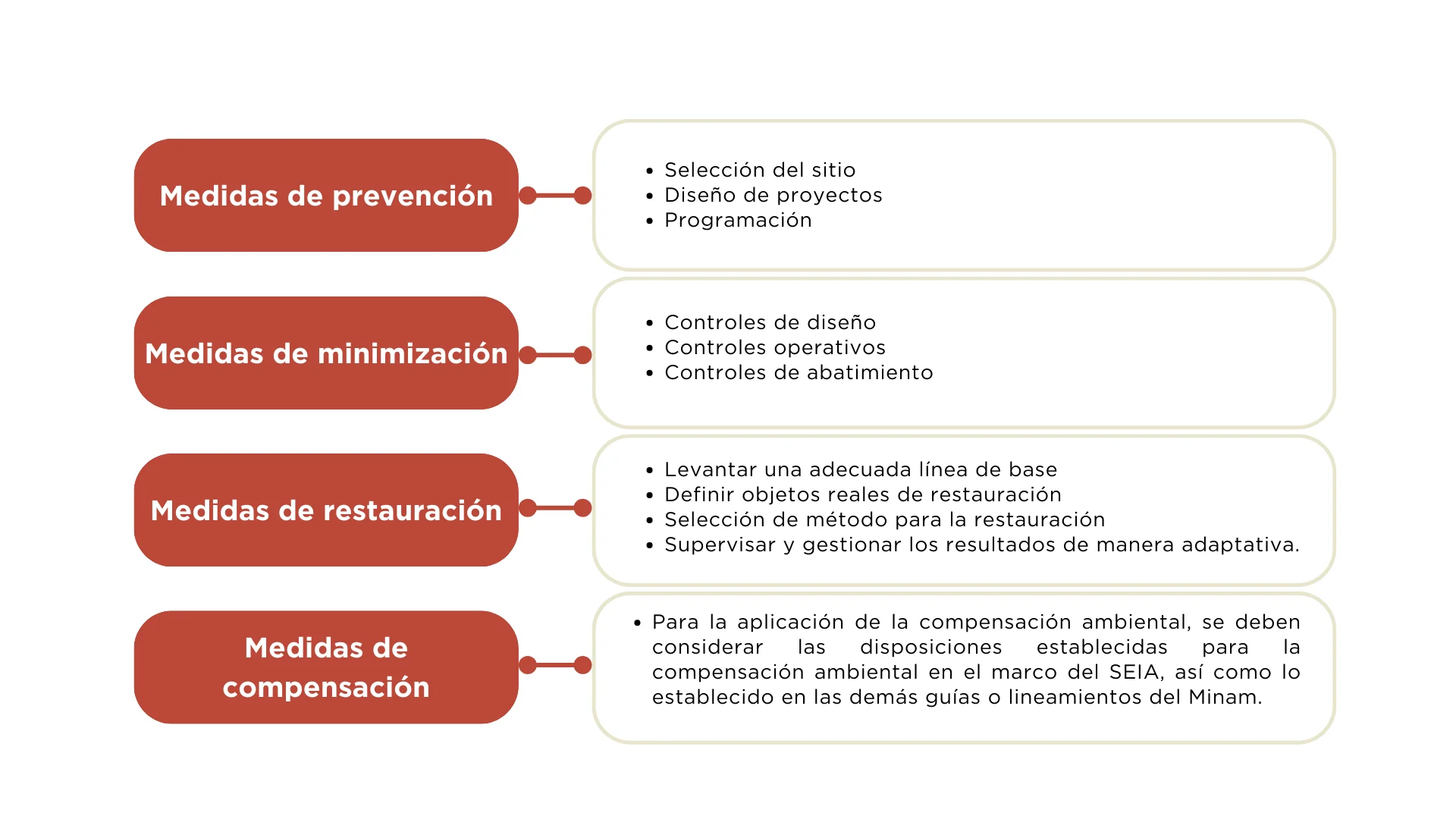 La JdM está conformada por cuatro tipos de medidas con la finalidad de atender el impacto ambiental negativo generado por el desarrollo de proyectos de inversión: i) medidas para evitar o prevenir, ii) medidas para minimizar o mitigar, iii) medidas para restaurar (por recuperación, rehabilitación o restauración ecológica), y iv) medidas para compensar.