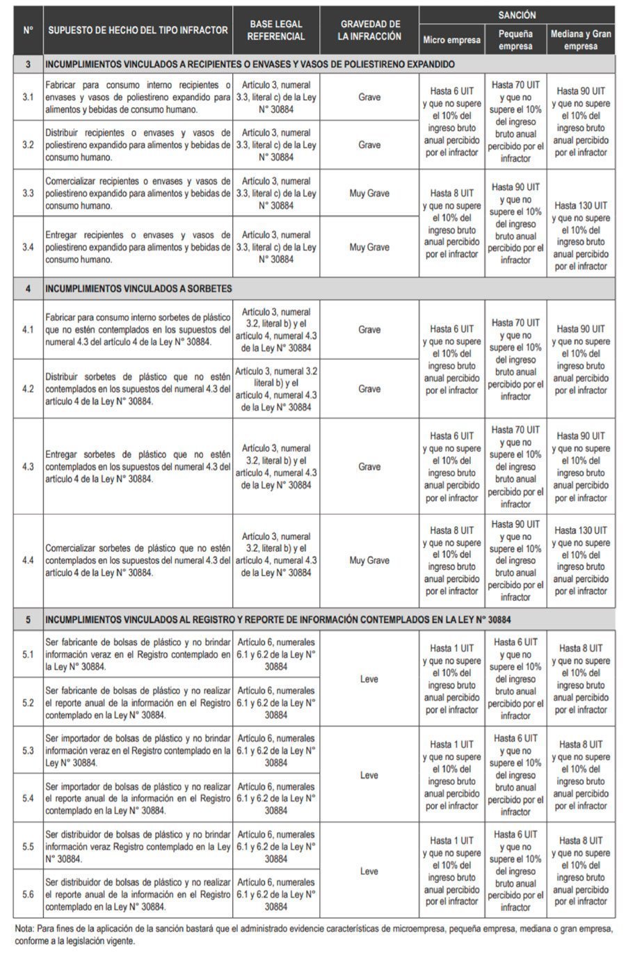 - Reglamento también presenta un cuadro de sanciones. Entregar bolsas, tecnopor o sorbetes de plástico puede ser sancionado hasta con 130 UIT, dependiendo del tipo de empresa y el lugar.