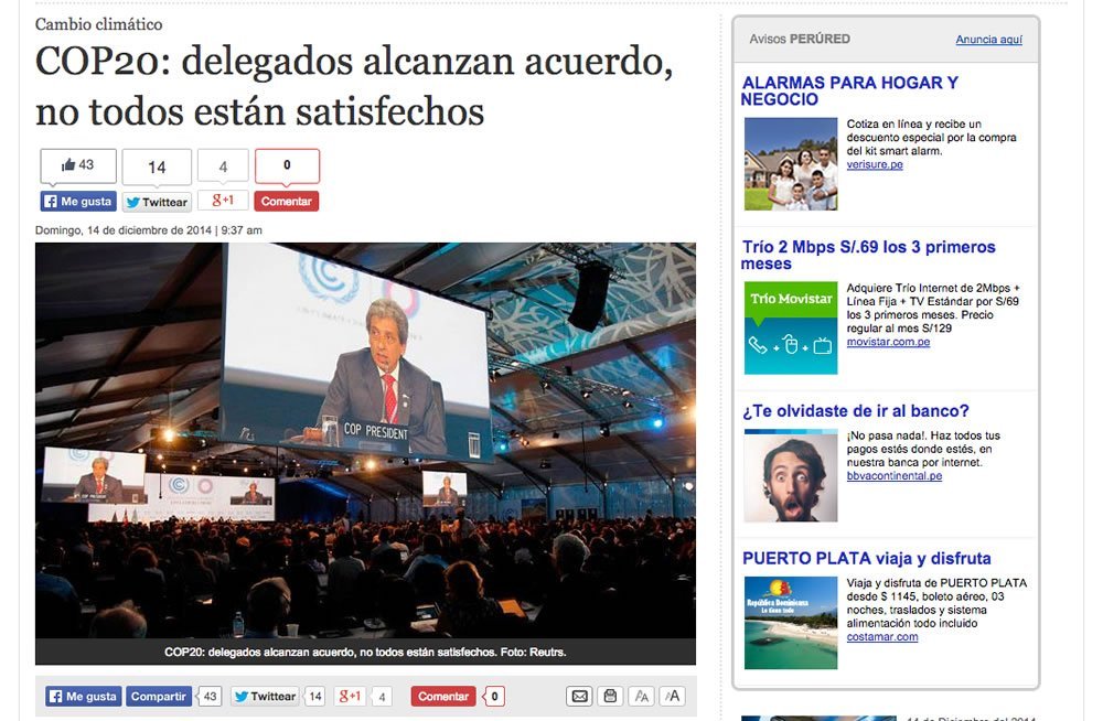 Los medios nacionales e internacionales informaron sobre el resultado final de la COP20, el denominado «Llamado de Lima frente a la acción climática». Muchos de ellos tomaron los resultados de la cumbre como un avance (aunque débil) en el proceso de acuerdo, rumbo a la COP21 de París.