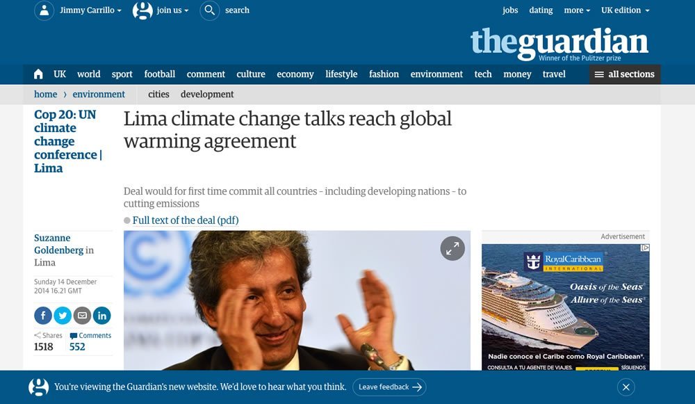 The Guardian: Conversaciones sobre cambio climático en Lima alcanzan acuerdo sobe el calentamiento global http://goo.gl/lXh5Dl