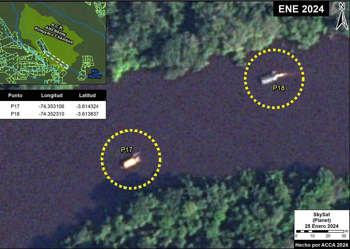 A la fecha, la minería ilegal se ha apoderado del Nanay y se extiende con fuerza hacia los ríos Pintuyacu y Chambira, los cuales alimentan con sus aguas al primero. Solo en el Nanay se identificaron 22 puntos con balsas mineras en enero de este año, según un último informe del Proyecto Monitoreo de la Amazonía Andina (MAAP). Todos estos hallazgos se ubican dentro del área de conservación regional. La situación en esta cuenca es tan grave que el paso hacia la parte alta -donde se encuentran las dragas- está restringido. “Si te ven que no eres de la zona y quieres pasar: te disparan”, advierte la defensora Marcelina Angulo.