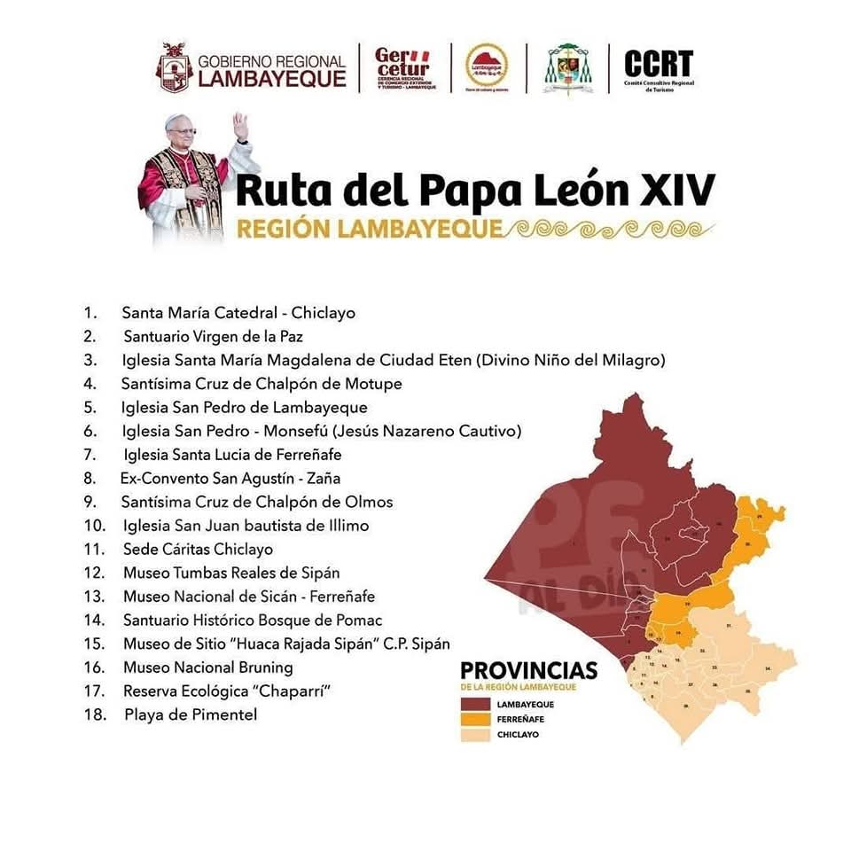 Por ello, autoridades locales y nacionales conformaron la “Mesa Técnica de la Ruta Turística: Caminos del Papa León XIV”, un espacio de articulación entre el Gobierno central, el Gobierno Regional de Lambayeque, municipalidades locales, la Iglesia católica y el sector privado. El objetivo fue establecer un recorrido por los lugares representativos del departamento por donde recorrió Robert Prevost antes de ser designado papa.