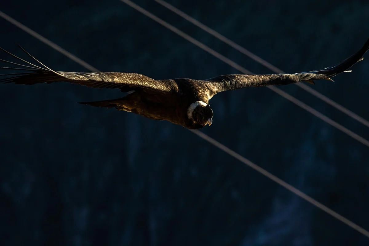 Cóndor andino volando sobre el cañón de Mayobamba durante la mañana fotografiado desde el mirador. Detrás de él, tres cables de tendido eléctrico. Foto: Víctor Gamarra Toledo