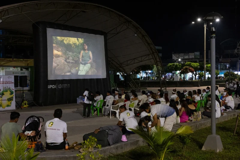 Durante el cineforo se presentaron, en la pantalla gigante de Conservamos por Naturaleza de la SPDA, los documentales El legado harakbut y Los nietos del huito. El primero, producido por Herlinda Italiano y Rolando Manuqueve, retrata la historia de la lideresa indígena Kelly Patiachi y el significado del Rostro Harakbut, un lugar sagrado en la Reserva Comunal Amarakaeri que en 2021 fue declarado Patrimonio Cultural de la Nación.