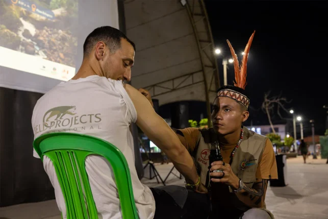 Como parte de la programación del evento, se dio un espacio a Luis Tayori Kendero, líder harakbut de la comunidad nativa Puerto Luz, reconocido por su labor en la investigación y revalorización de la cultura de su pueblo. Tayori, con ayuda del joven comunicador Ronaldo Manuqueve, realizó una demostración del pintado corporal tradicional con huito, el fruto amazónico utilizado ancestralmente por los harakbut para teñir la piel de forma natural y temporal.