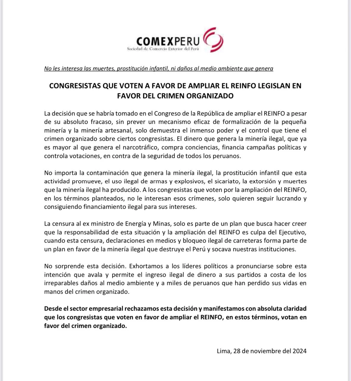 En un comunicado, ComexPerú señaló que los “congresistas que voten a favor de ampliar el Reinfo legislan a favor del crimen organizado” y que “no les interesa las muertes, prostitución infantil, ni daños al medio ambiente”.