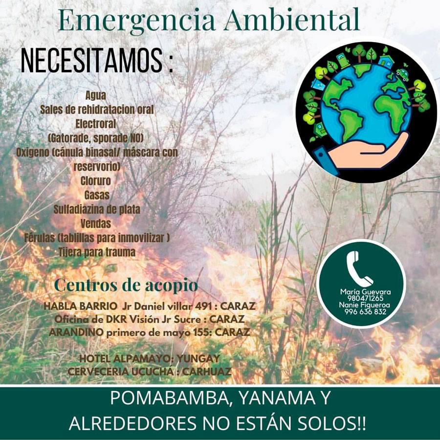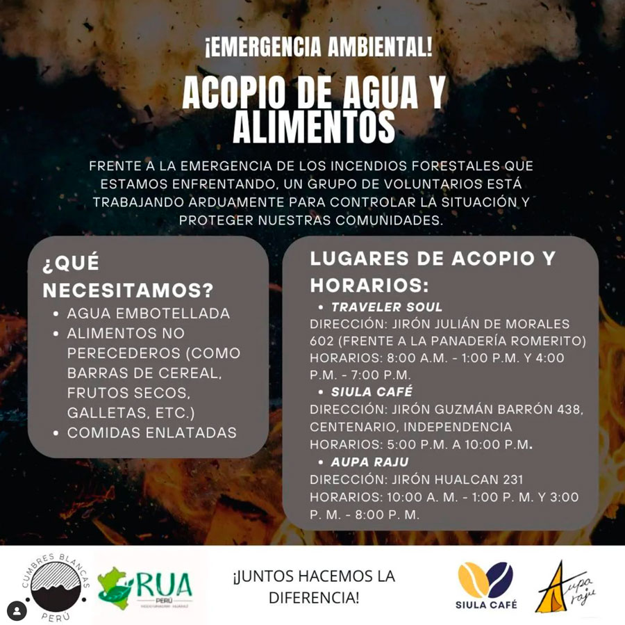 A través de Cumbres Blancas Perú y la Red Universitaria Ambiental, se está recaudando fondos y solicitando voluntarios para ayudar con los trabajos para detener el fuego en diversas zonas del Callejón de Huaylas, en Áncash.
