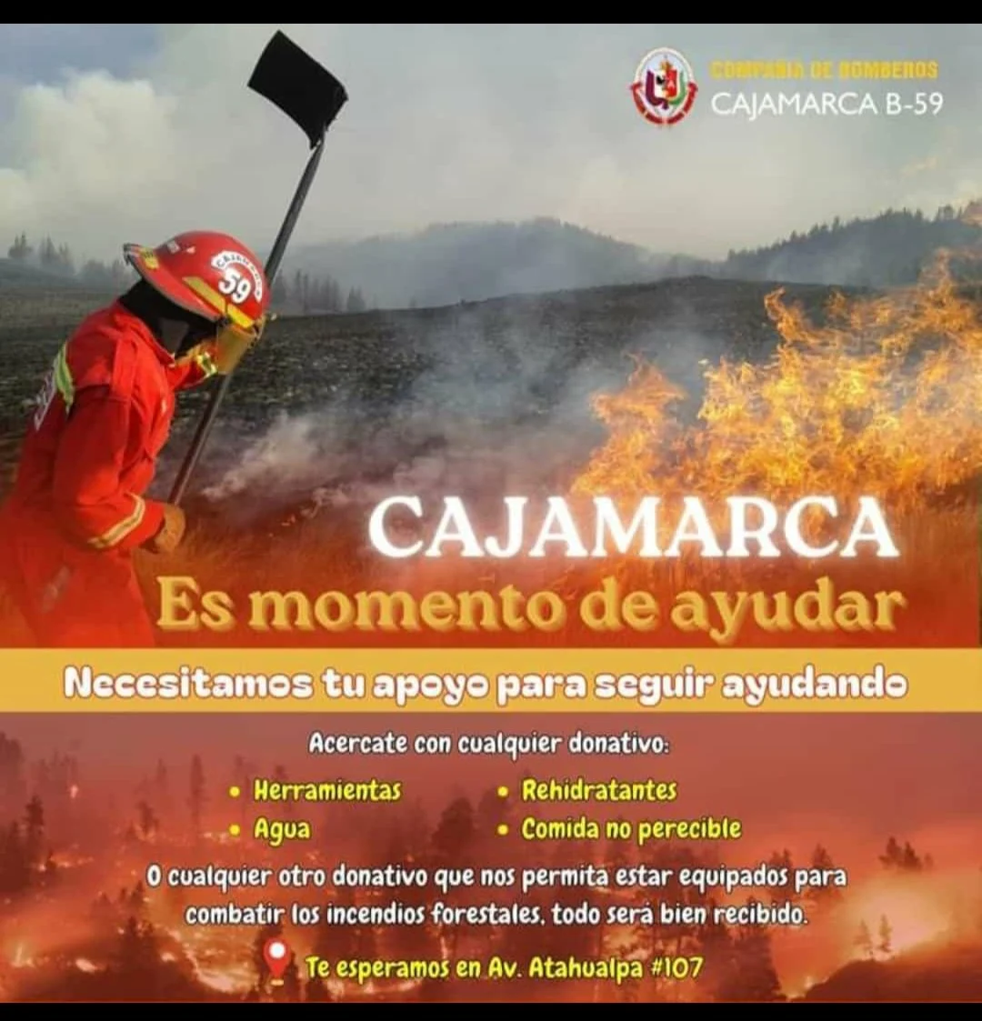 Cajamarca también es otra de las regiones afectadas por los incendios. Por ello, la Compañía de Bomberos Voluntarios está recaudando materiales, agua y comida no perecible. Para donar, puedes acercarte a la Av. Atahualpa 107.