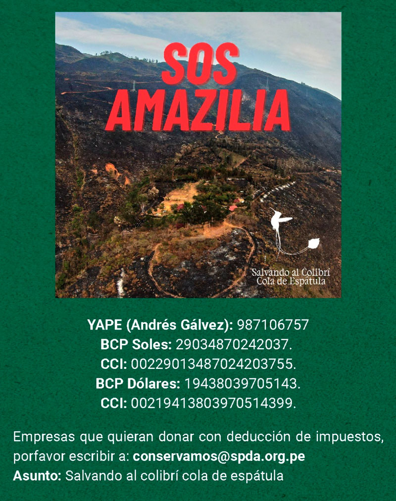 Colabora con el área de conservación Amazilia Bioreserva, que ya perdió 200 hectáreas debido al fuego. Este lugar ayuda a conservar y proteger al colibrí cola de espátula y otras especies.