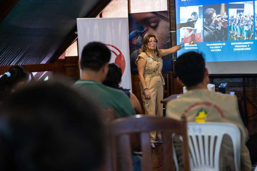 “Sabemos que actualmente nuestras comunidades están vulnerables y estos talleres nos ayudan a alzar nuestras voces como pueblos indígenas, tanto para defender nuestros derechos, como para promocionar el turismo o las artesanías para que sean una fuente de desarrollo sostenible para nuestras comunidades”, resalta Fiorella Tayori, comunicadora indígena del pueblo harakbut, de la comunidad nativa de Shintuya.