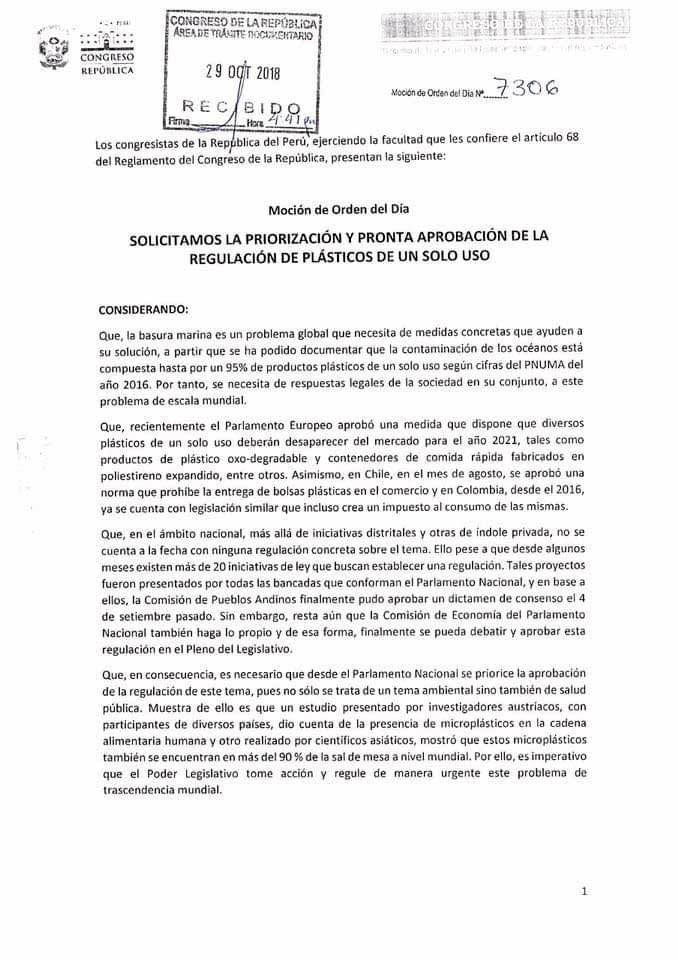 Legisladores de diversas bancadas solicitaron la “priorización y urgente debate en la Comisión de Economía y en el Pleno del Congreso de la República” el debate sobre la ley que regula los plásticos de un solo uso, como las bolsas, cañitas, entre otros.