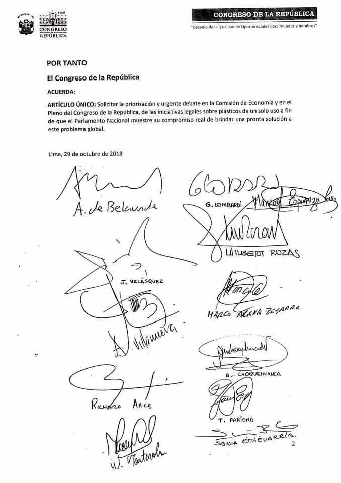 El documento está firmado por los congresistas Alberto de Belaúnde (independiente), Guido Lombardi (Peruanos por el Kambio), Marisol Espinoza (Alianza para el Progreso), Wilbert Rozas y Marco Arana (Frente Amplio), Tania Pariona y Richard Arce (Nuevo Perú), Sonia Echevarría (independiente), entre otros.