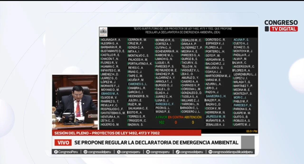 El Congreso de la República aprobó con 102 votos a favor la ley que reforma la declaratoria de emergencias ambientales en Perú. Esta propuesta fue presentada a partir de las deficiencias normativas que evidenció el derrame de petróleo de la Refinería La Pampilla en Ventanilla, considerado como el peor desastre ecológico de los últimos años.