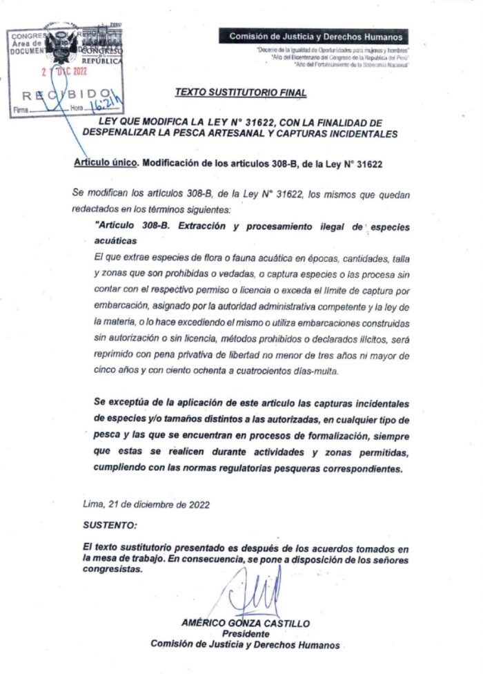 “Frente a la desinformación que existía, se ha sobrepuesto la información objetiva y de carácter técnico. Así, el Congreso ha realizado las precisiones necesarias en esta ley a fin de que los pescadores artesanales no sean afectados con su aplicación”, señala Percy Grandez, especialista legal de la Sociedad Peruana de Derecho Ambiental (SPDA). Con la modificación de dicho artículo que fue aprobado por 106 votos, los pescadores artesanales podrán continuar realizando su actividad bajo las regulaciones de dicha actividad.