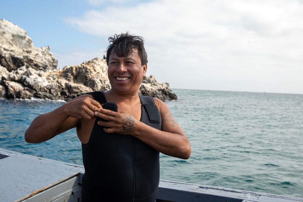 Unos kilómetros más al norte, en la calurosa Paita, Julio Benites nos cuenta que se inició en el buceo artesanal casi por curiosidad y que hoy lo ha convertido en su medio de vida. Julio es uno de los 900 buzos pulmoneros artesanales que existen en el Perú: ellos tienen un trabajo especializado, pues se valen solo de la capacidad de sus pulmones para contener la respiración y sumergirse entre 5 y 20 metros bajo el mar para capturar pulpo, erizo, otros mariscos y peces.