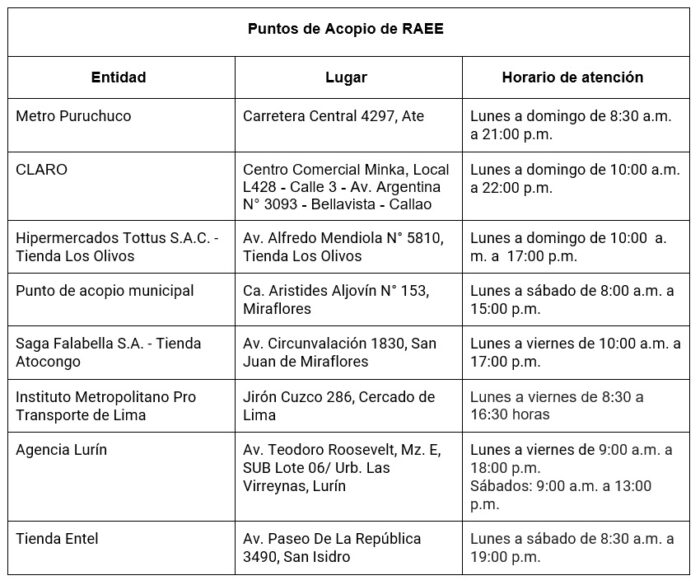 En el Perú existen diversos puntos de acopio de RAEE. Algunos de estos fueron implementados gracias al trabajo conjunto entre empresas y municipios. Entre los puntos de acopio en Lima se encuentran los siguientes: