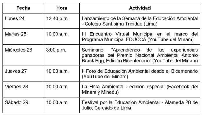 • Del 24 al 28 de octubre, el Ministerio del Ambiente (Minam) y el Ministerio de Educación (Minedu) realizarán actividades y retos que incluirán la participación de la ciudadanía.