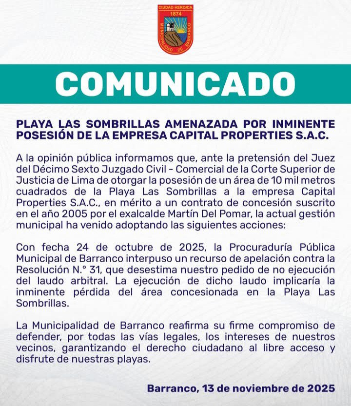 La última semana, la Municipalidad de Barranco alertó sobre una resolución judicial que ordena entregar parte de la playa Las Sombrillas a una empresa privada para construir un centro comercial. Según la alcaldesa de dicho distrito, Jéssica Vargas, el proyecto tendría consecuencias sobre el ecosistema y los derechos de uso del espacio público.