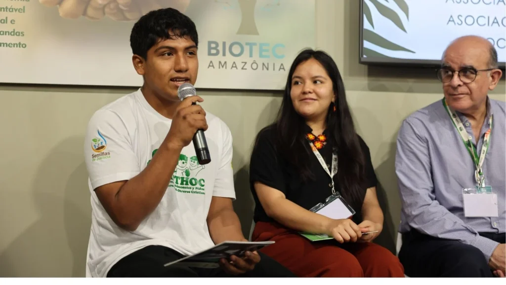 Desde Perú, llegaron a la COP30 Gianella y Jherico, dos adolescentes de San Martín y Piura respectivamente e integrantes del MANTHOC, quienes asistieron a diversos eventos en los cuales compartieron sus vivencias sobre cómo el cambio climático afecta a sus territorios, como las sequías, la pérdida de biodiversidad, las olas de calor, entre otros. Uno de estos eventos fue organizado por la UNAMAZ y contó también con la participación en el panel de la SPDA y Save the Children.