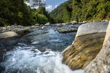 Parte de esta riqueza natural es el río Araza, que atraviesa ese territorio como una columna vertebral. Sus aguas abastecen a las comunidades del distrito de Camanti y a otras poblaciones contiguas, y sirven para el consumo humano, la agricultura y la pesca. Como toda cuenca hídrica, este río constituye una fuente de vida, y es conocido como una “fábrica de agua”, porque captura humedad para el valle y mantiene condiciones favorables para la producción de cacao, el copoazú, etc.