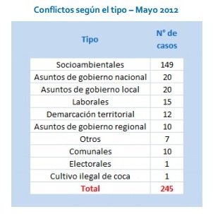 Según el último Reporte de Conflictos Sociales de la Defensoría del Pueblo, en el mes de mayo se registraron 173 conflictos, de los cuales 149 son de carácter socioambiental. Entre ellos figura el caso del proyecto minero Conga en Cajamarca, donde aún no se ha vuelto a establecer el diálogo.