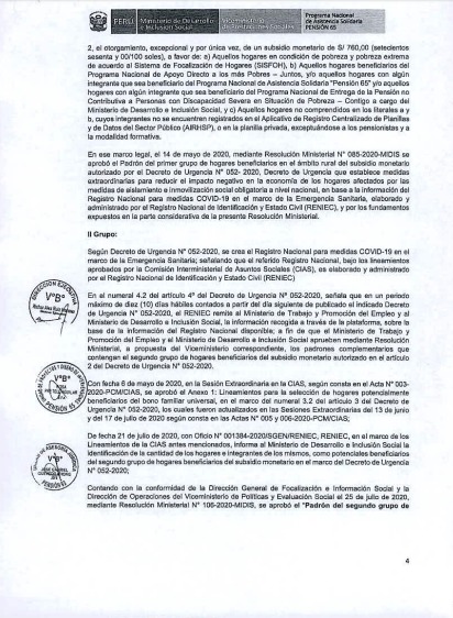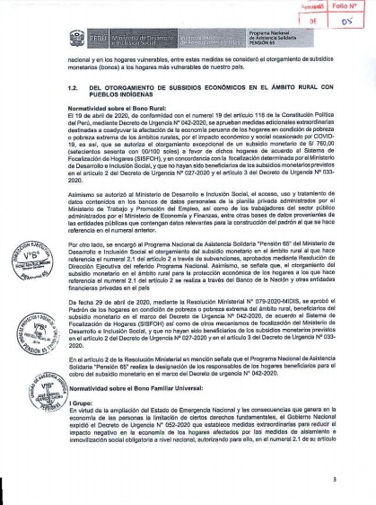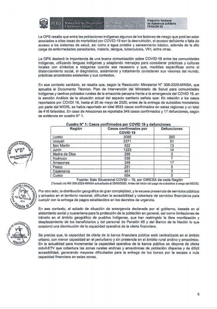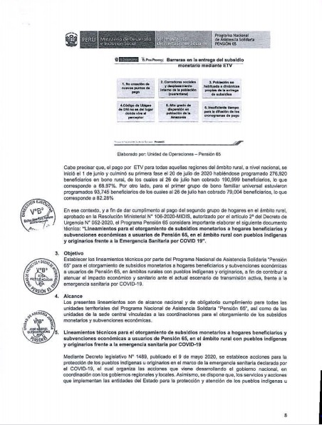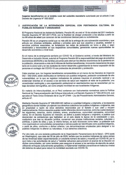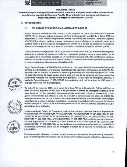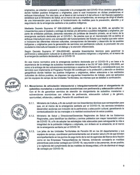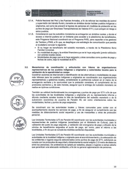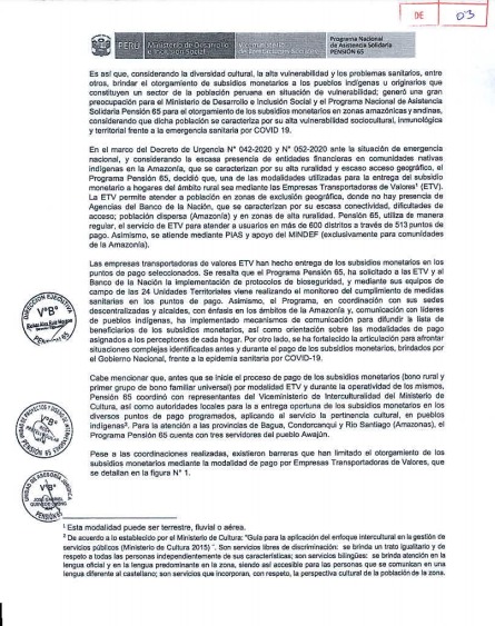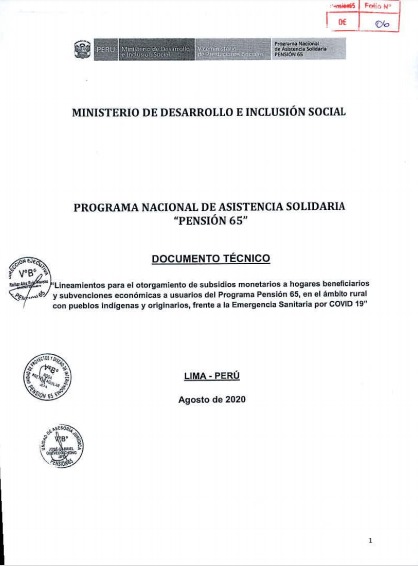 Como se recuerda, a inicios de agosto, el Midis publicó el documento técnico «Lineamientos para el otorgamiento de subsidios monetarios a hogares beneficiarios y subvenciones económicas a usuarios del Programa Pensión 65, en el ámbito rural con pueblos indígenas y originarios frente a la Emergencia Sanitaria por COVID 19», que contempla mecanismos de articulación intersectorial e intergubernamental para la entrega de bonos con pertinencia y adecuación cultural.