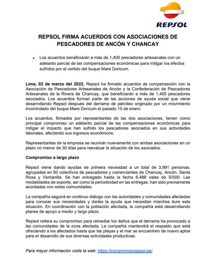 A través de un comunicado, la empresa indicó que los acuerdos fueron firmados con la Asociación de Pescadores Artesanales de Ancón y la Confederación de Pescadores Artesanales de la Rivera de Chancay, cuyos beneficiados serían más de 1400 personas. Sin embargo, Repsol no informó sobre el estado de otros gremios que trabajan, por ejemplo, en Ventanilla y Santa Rosa.